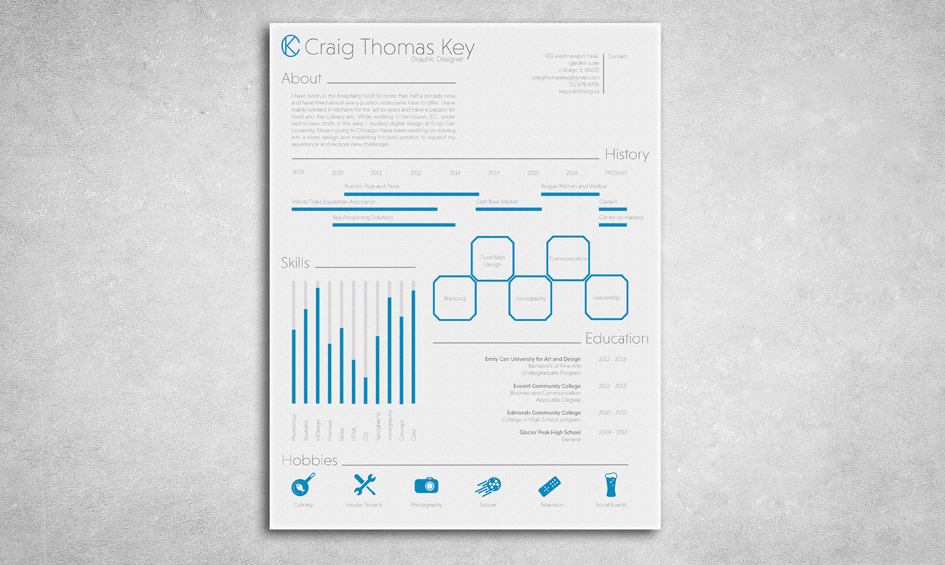 This is a set of mock ups for my personal resume. Recently revamped in order to attract more attention and display more about my personality and design skills.